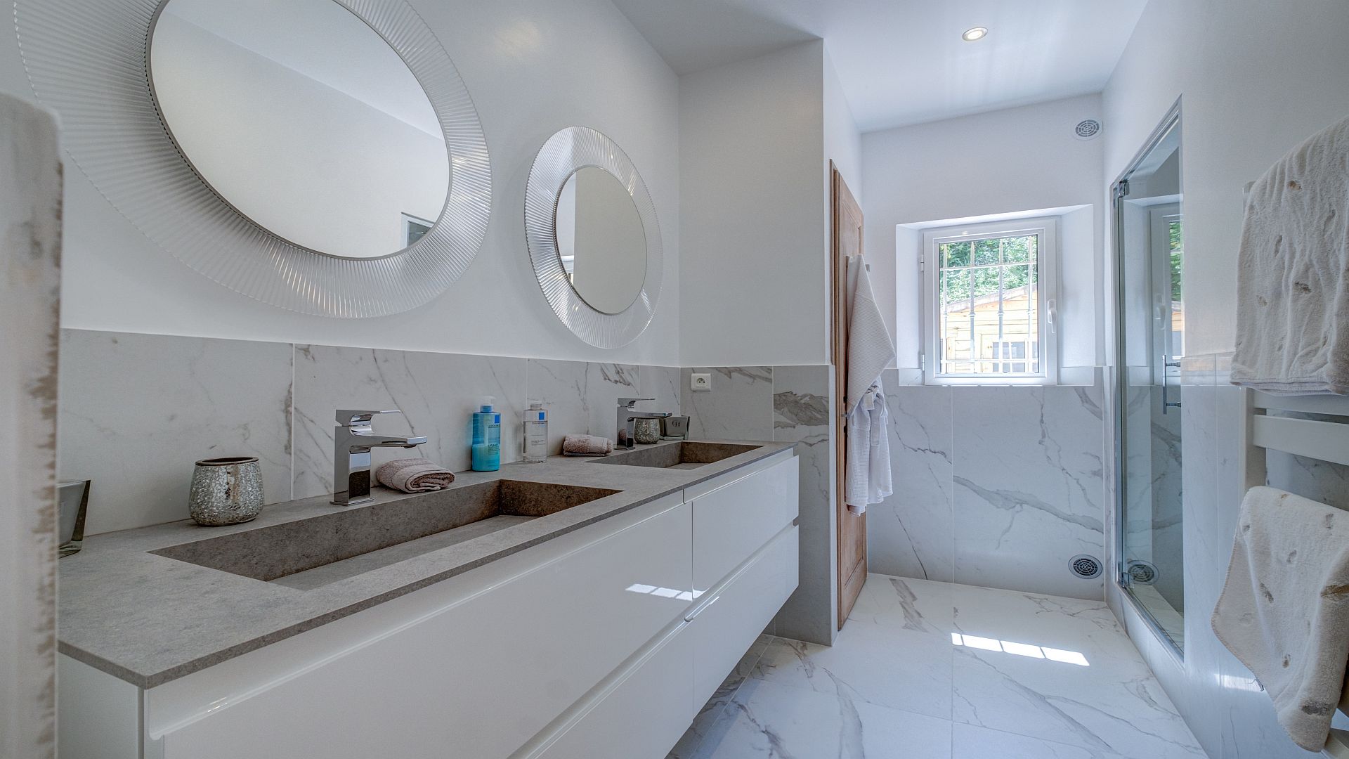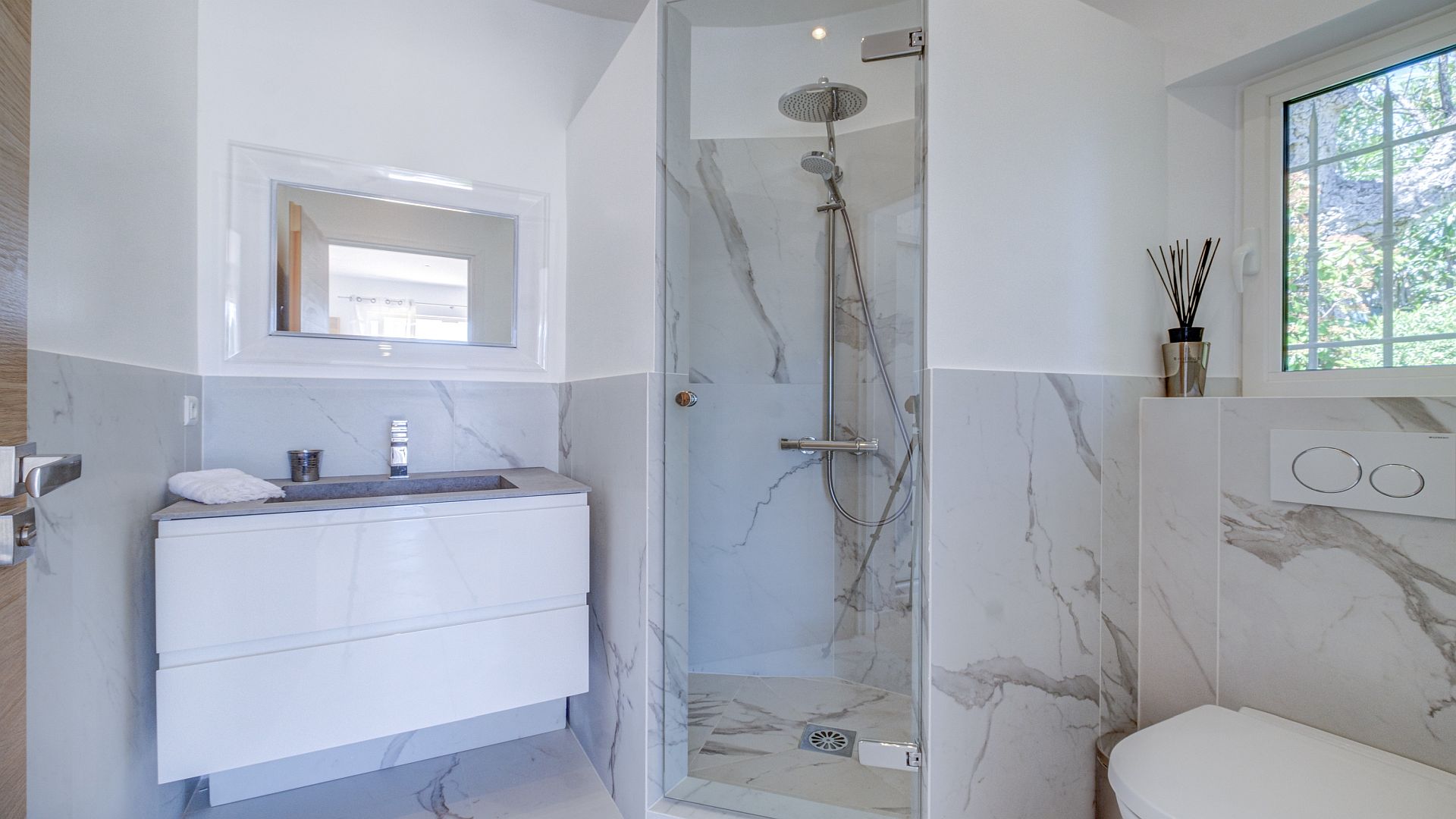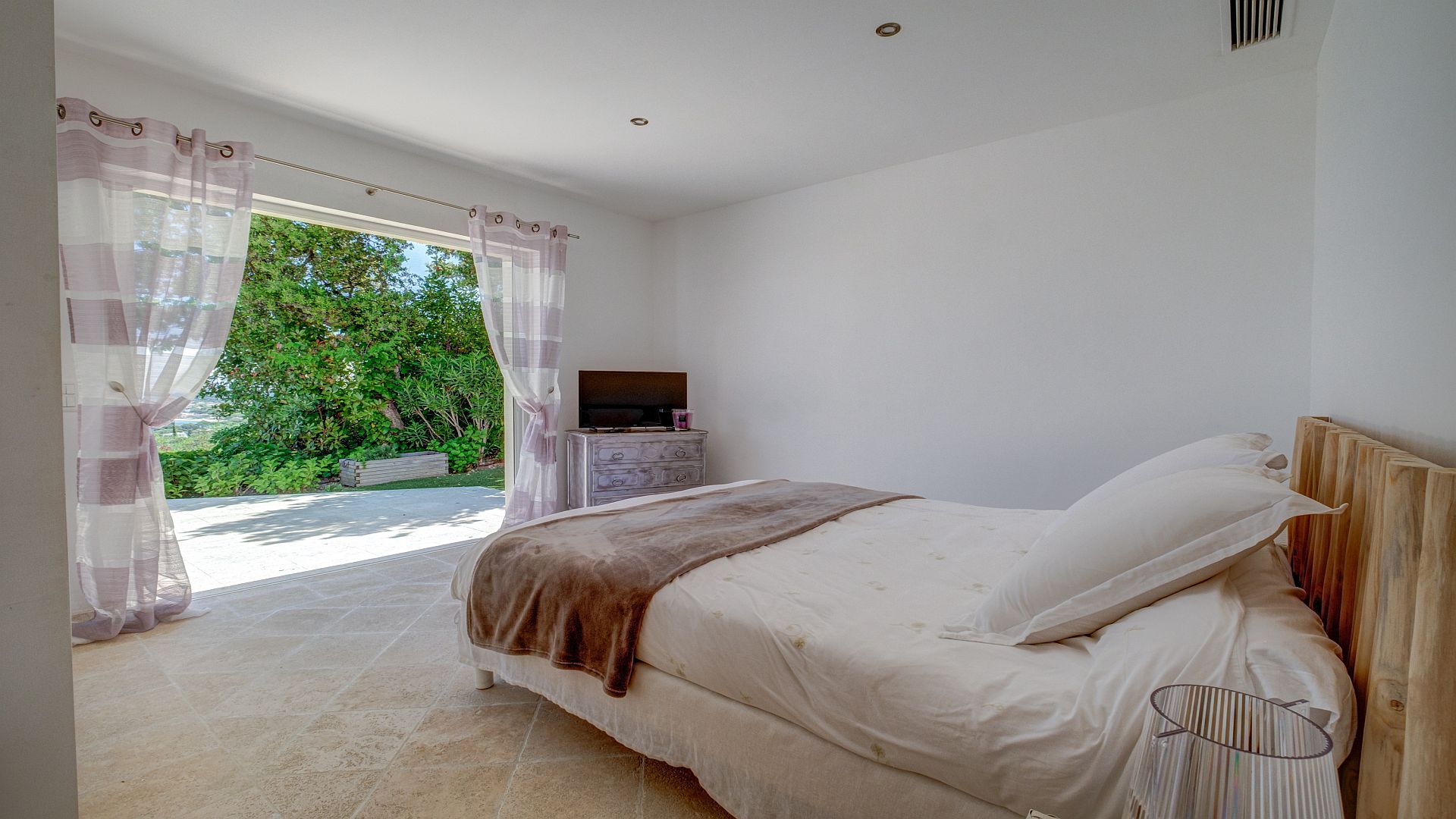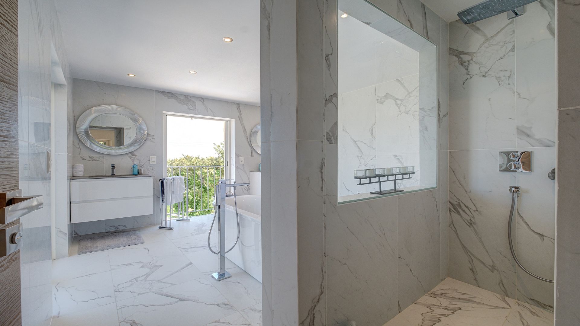 Large master bedroom (50 m²) with en-suite bathroom featuring a spa bath and shower, a large dressing room, and a private terrace with sea view