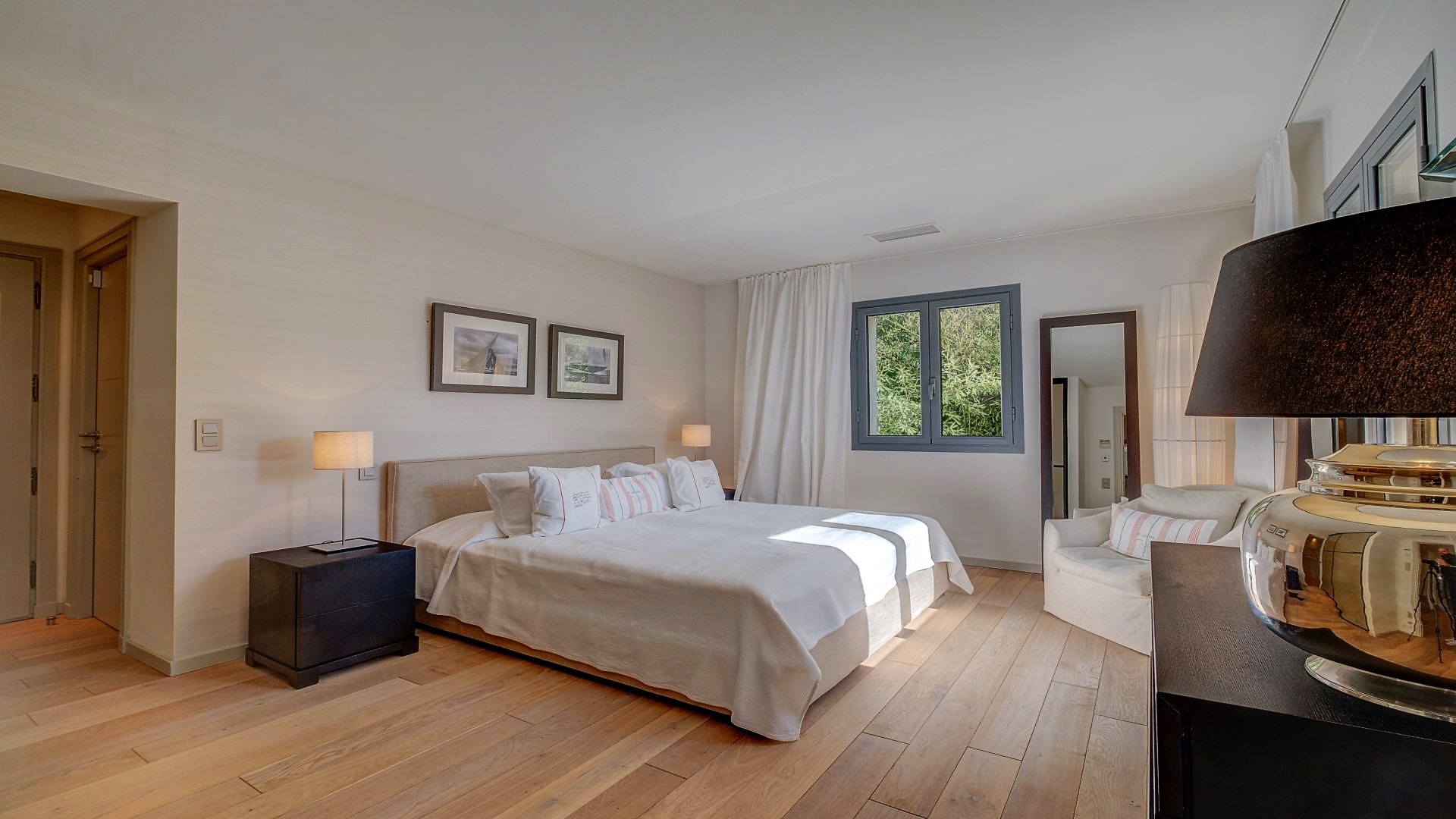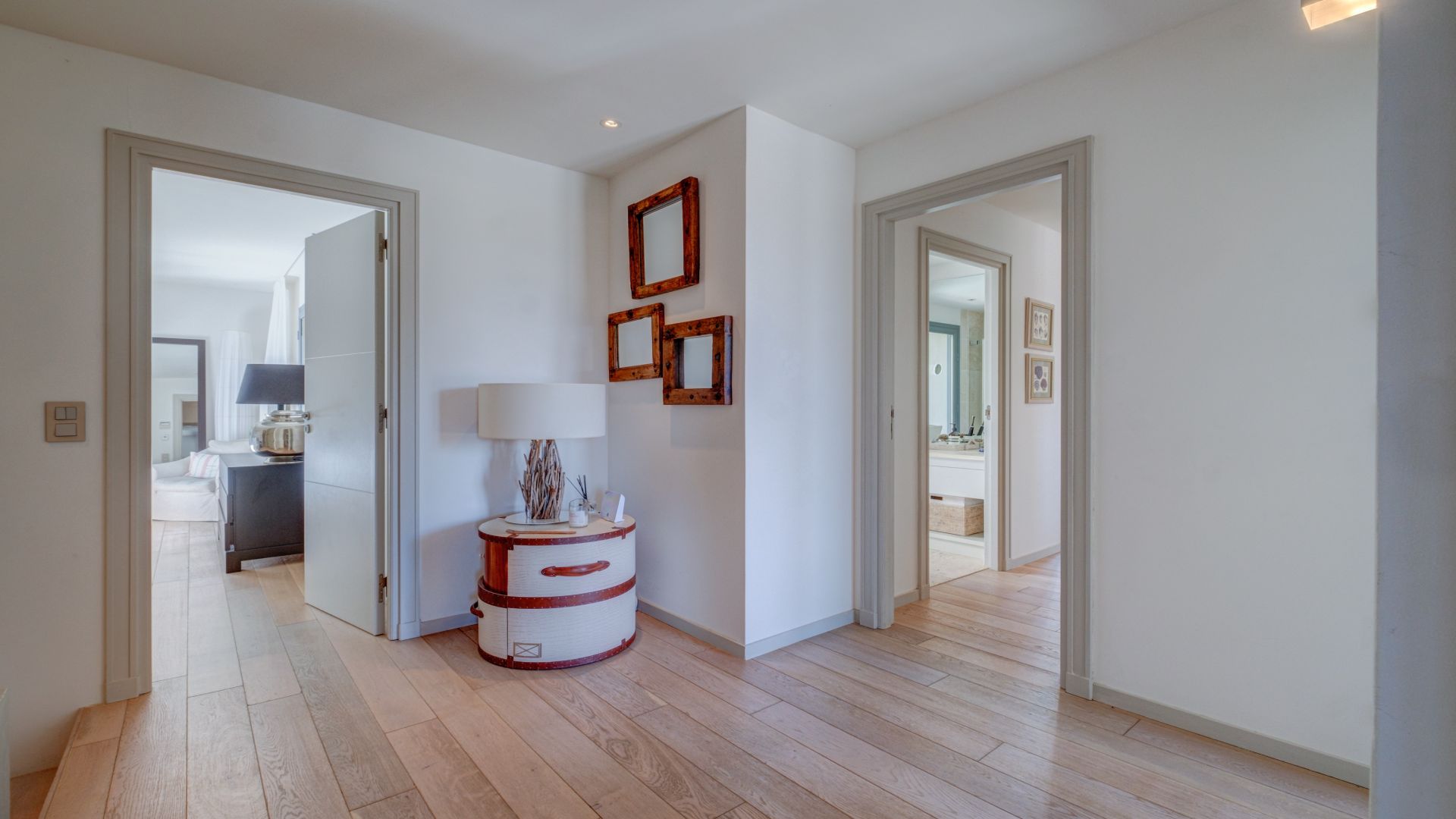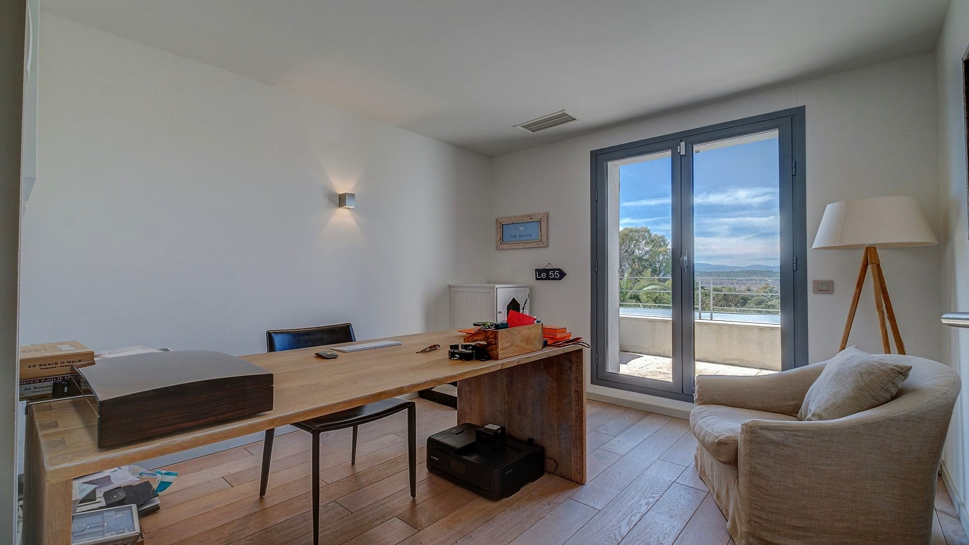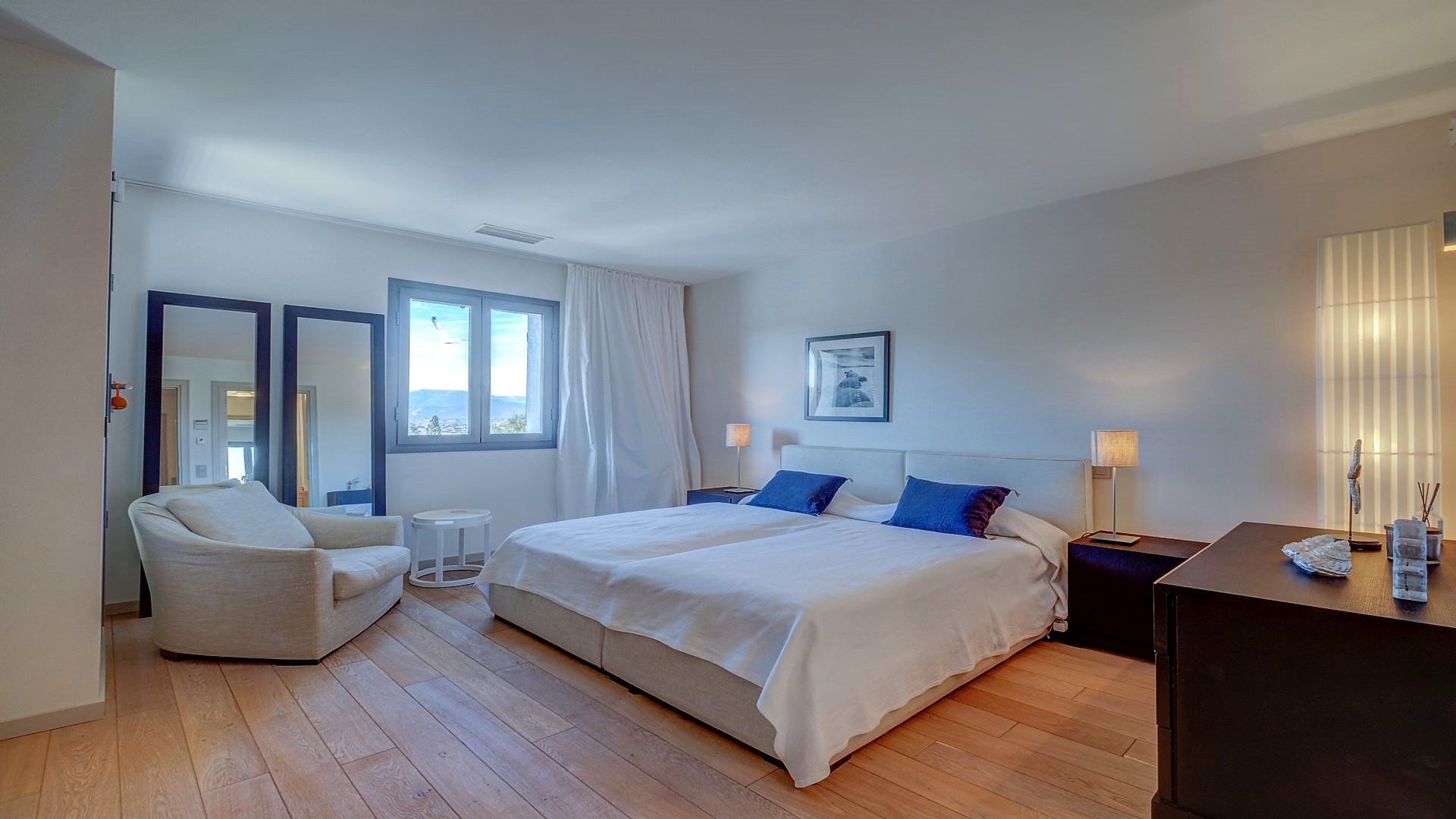 On the first floor, you will find the master bedroom with an en-suite bathroom and a private balcony, two additional double bedrooms each with en-suite bathrooms, and a home office. All bedrooms are equipped with a television.