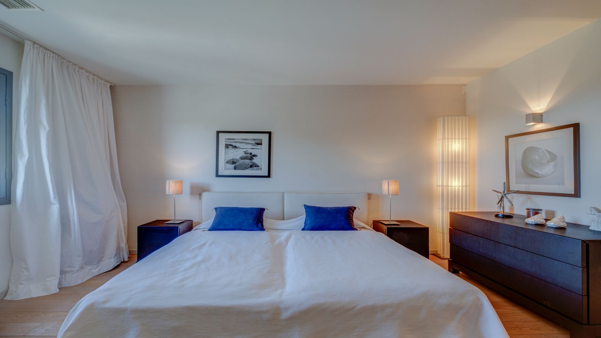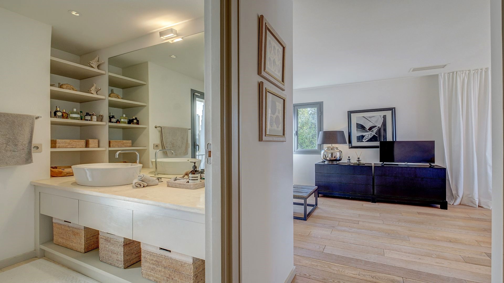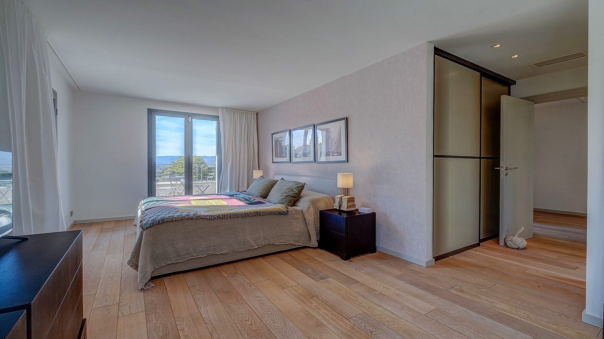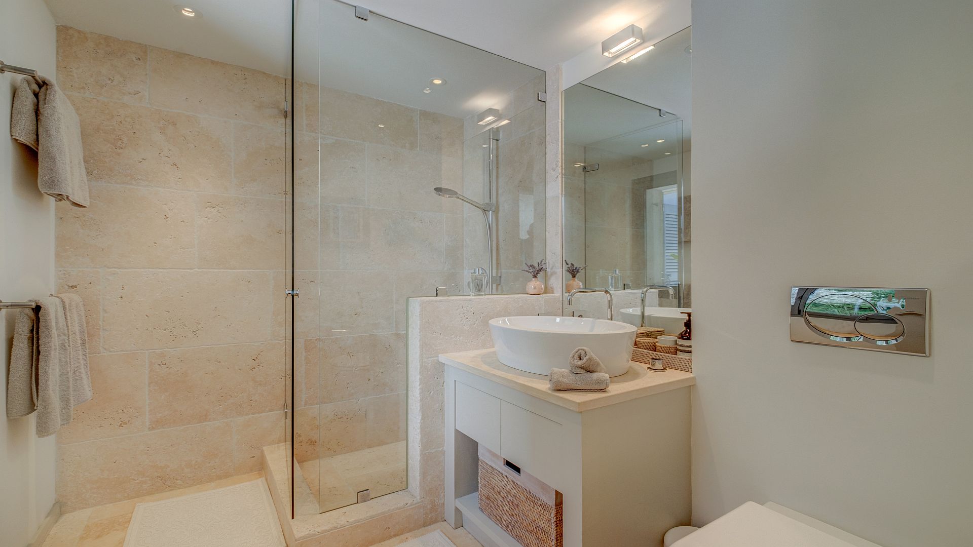 On the first floor, you will find the master bedroom with an en-suite bathroom and a private balcony, two additional double bedrooms each with en-suite bathrooms, and a home office. All bedrooms are equipped with a television.