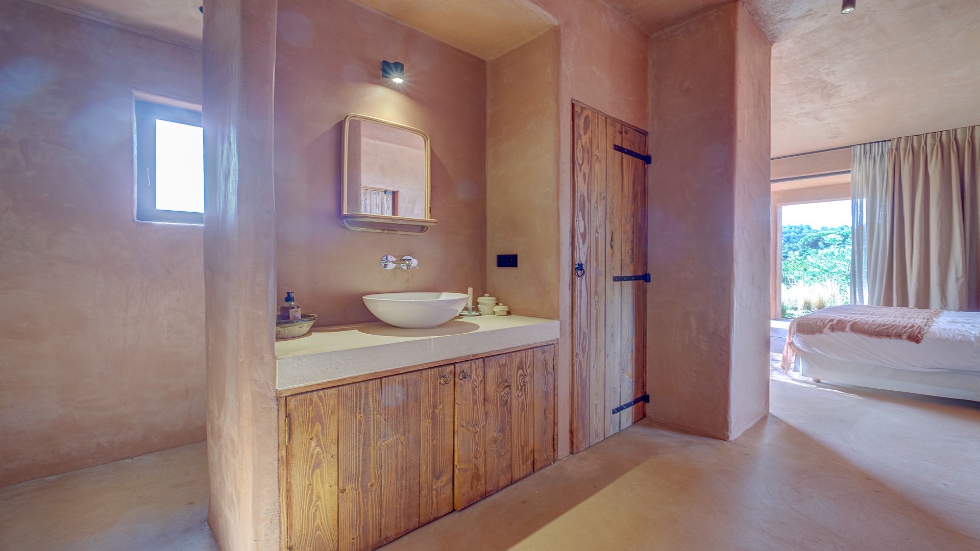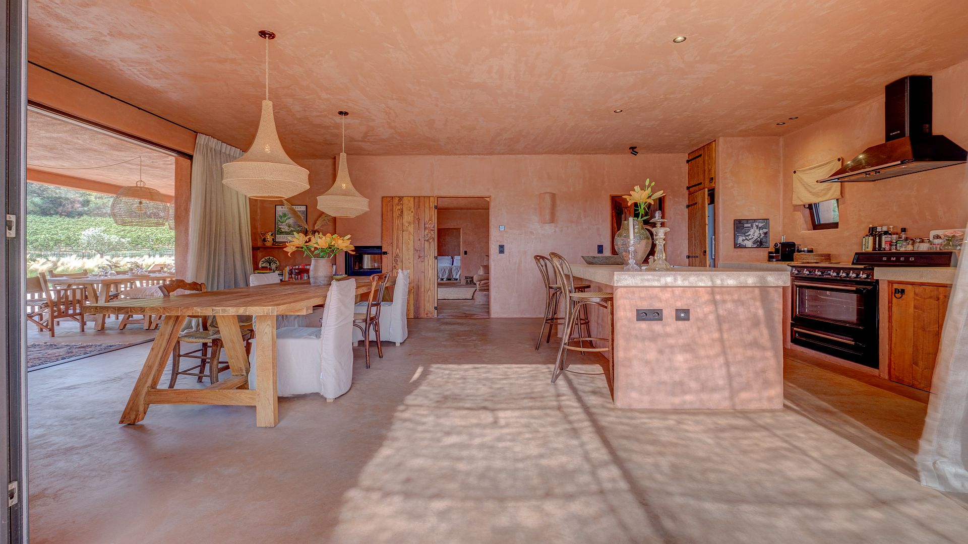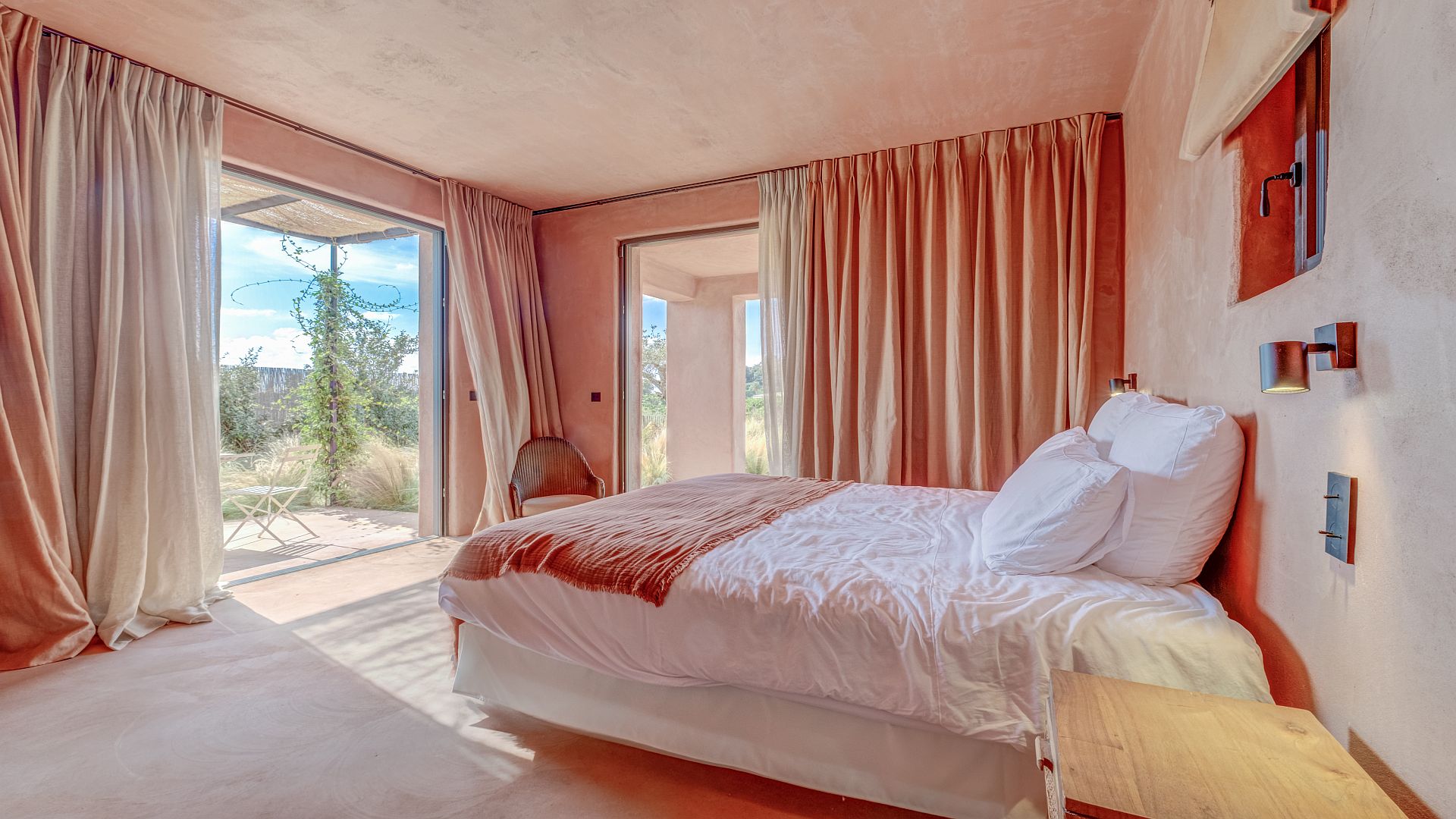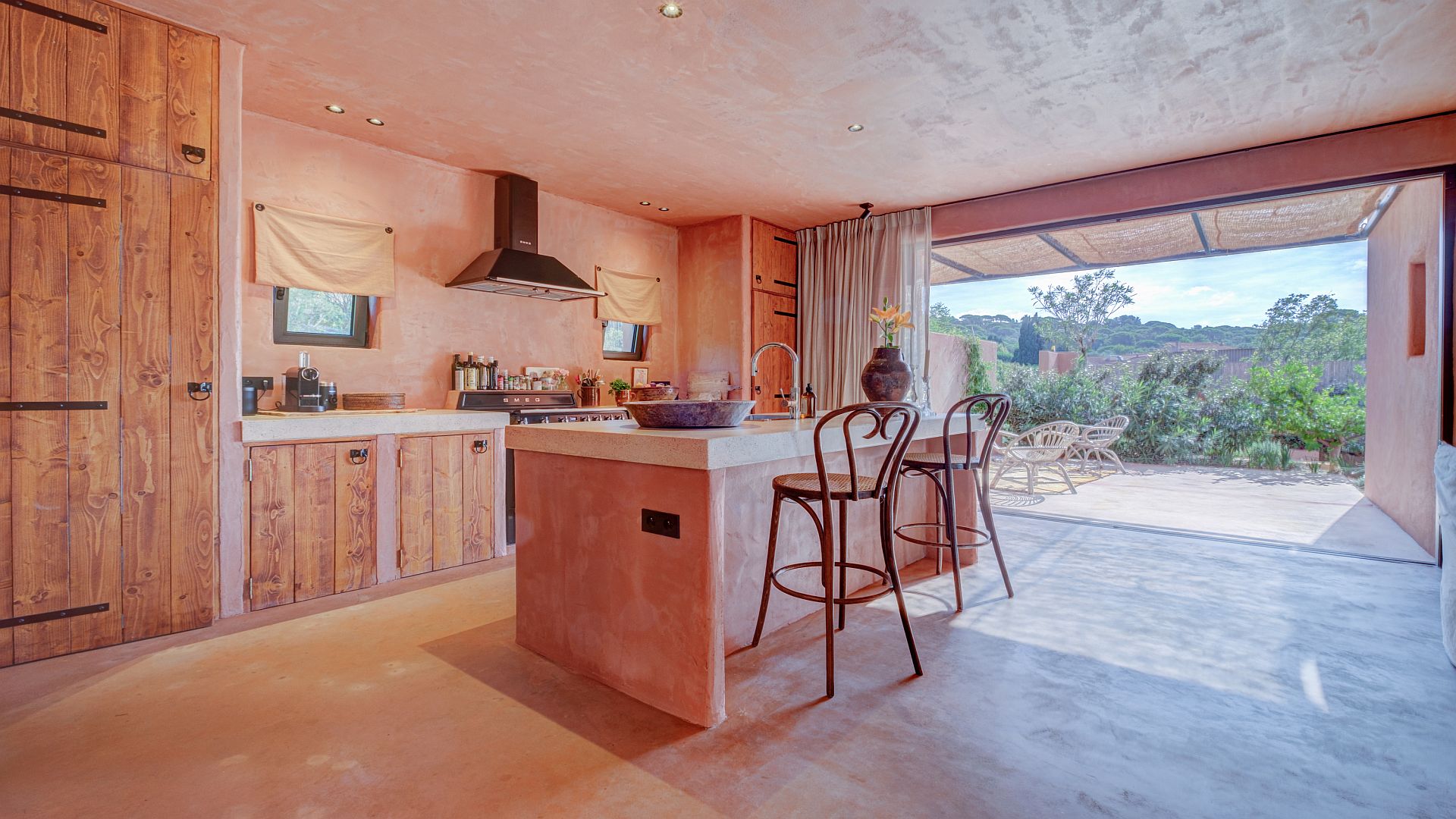 The villa comprises an entrance hall, a fully equipped kitchen with dining area opening onto two covered terraces, and a living room with fireplace and direct access to the terrace. On the ground floor, there are two double bedrooms, each with its own en-suite bathroom; the master bedroom also features a large private outdoor shower. On the first floor, you will find two additional double bedrooms, each with a private bathroom and access to a large, partly covered terrace offering beautiful sea views.