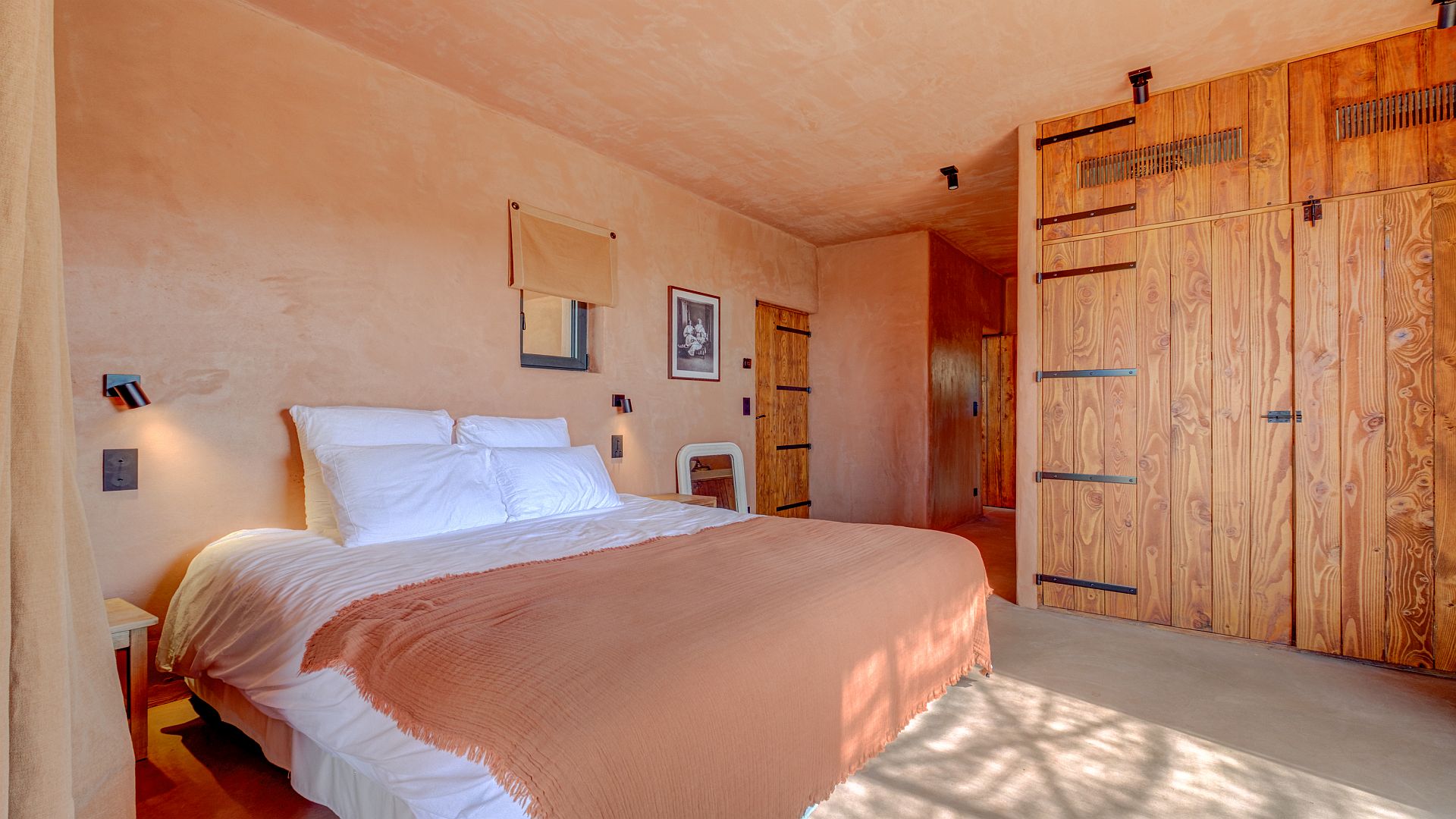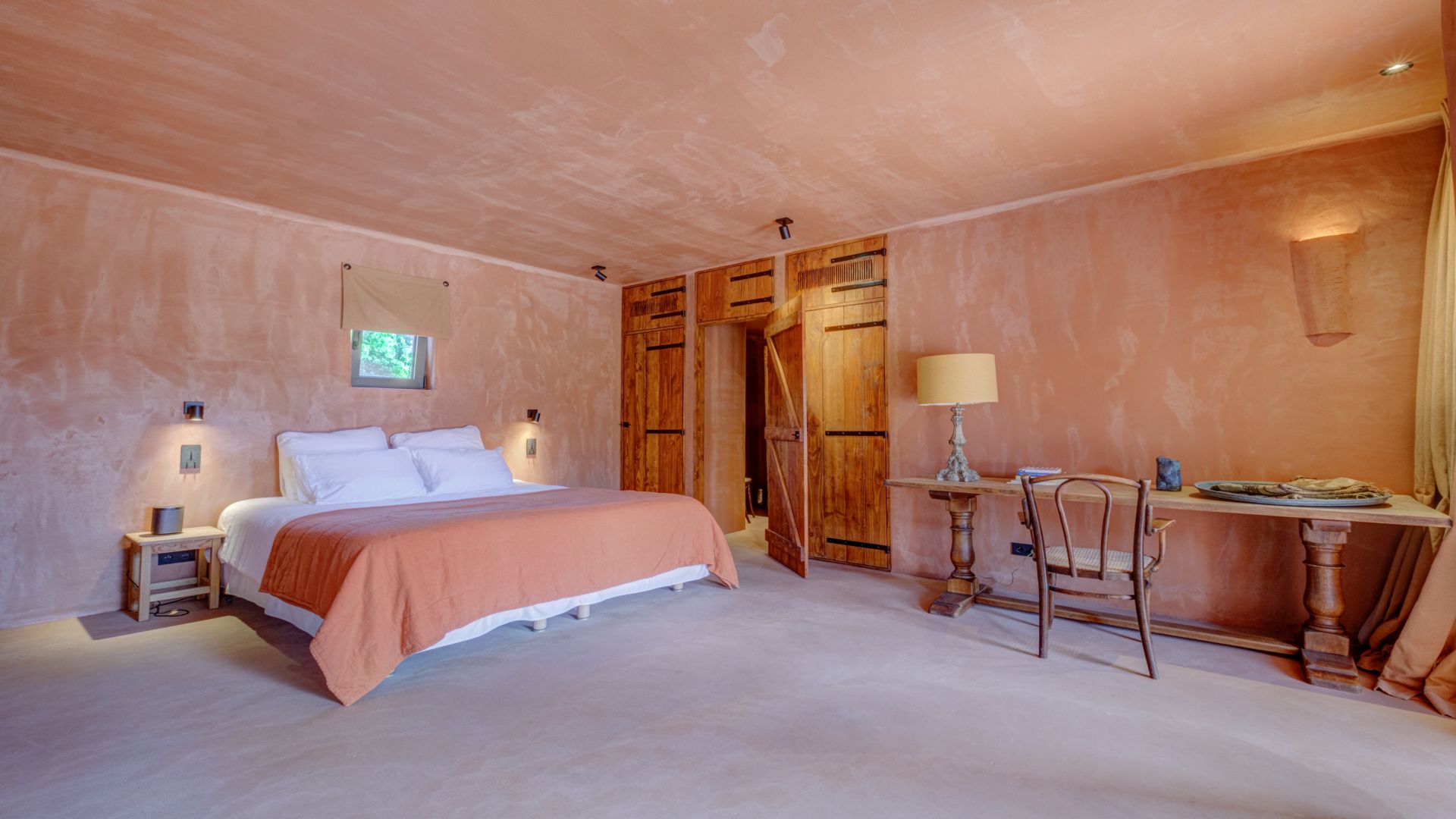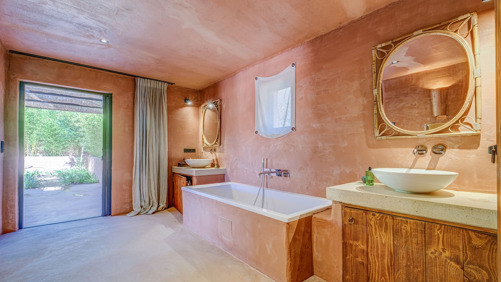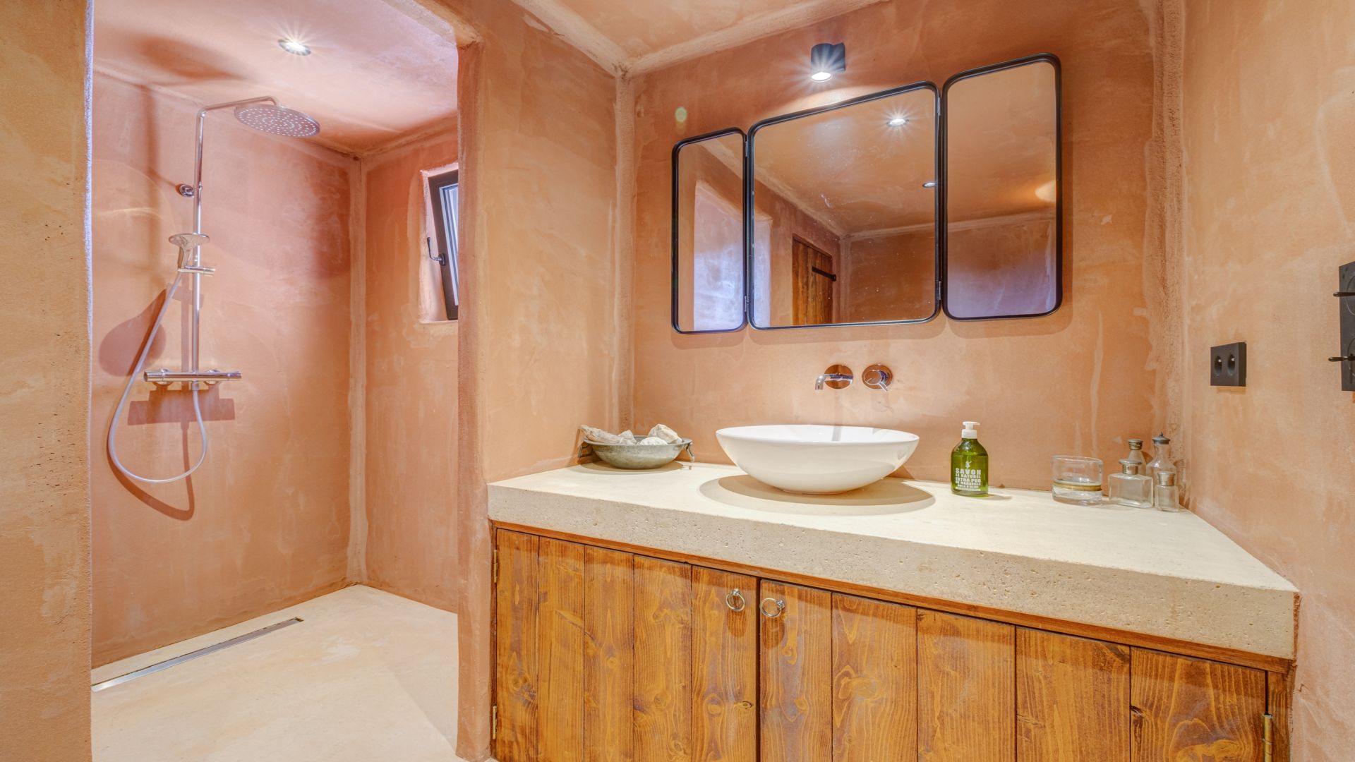 The villa comprises an entrance hall, a fully equipped kitchen with dining area opening onto two covered terraces, and a living room with fireplace and direct access to the terrace. On the ground floor, there are two double bedrooms, each with its own en-suite bathroom; the master bedroom also features a large private outdoor shower. On the first floor, you will find two additional double bedrooms, each with a private bathroom and access to a large, partly covered terrace offering beautiful sea views.