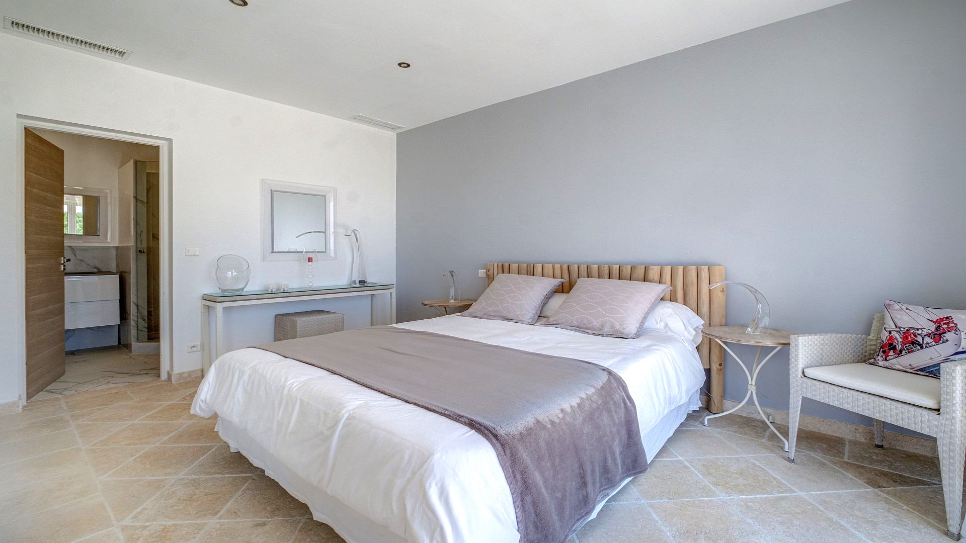 Large master bedroom (50 m²) with en-suite bathroom featuring a spa bath and shower, a large dressing room, and a private terrace with sea view